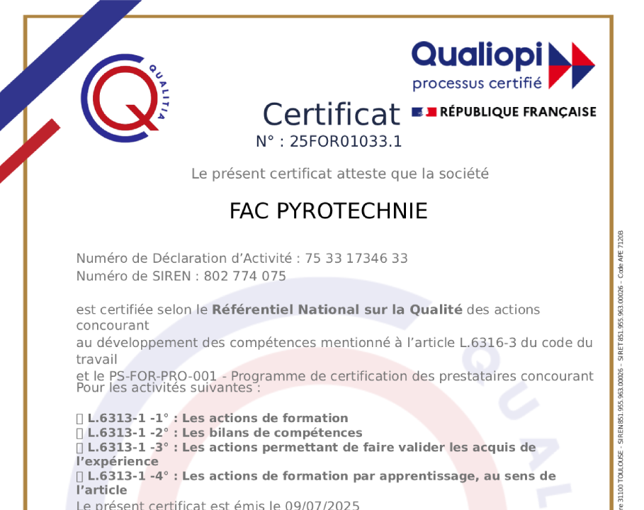 FAC PYROTECHNIE vous assiste dans vos démarches réglementaires, dispense diverses formations dans la sécurité pyrotechnique ou encore vous accompagne dans la réalisation d’audit de sécurité pyrotechnique.