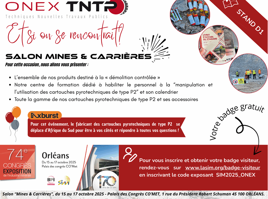ONEX TNTP & FAC PYROTECHNIE vous attendent au 74e Congrès du Salon Mines & Carrières ! Plongez au cœur de la démolition contrôlée et de la sécurité pyrotechnique : nos experts seront ravis de vous accueillir, d’échanger avec vous et de vous présenter nos formations spécialisées. Conseils, démonstrations et solutions sur mesure vous attendent sur notre stand !